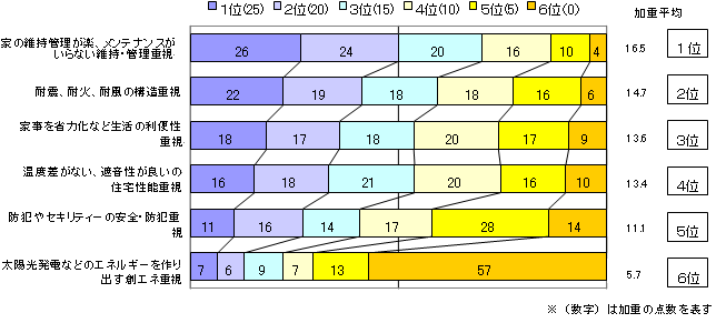 2.老後の住まいの重視点老後の住まいについては、性能面とプランの両面から重視点を探りました。まず性能面で重視する1位は、「家の維持管理が楽で、メンテナンスがいらない(維持管理性能)」(加重平均16.5)、2位「耐震、耐火、耐風の構造性能」(同14.7)、3位「家事の省力化など生活利便性」(同13.6)となっています。高齢期では身体の低下や経済面から、家の維持管理のしやすさが重視されると思われます。