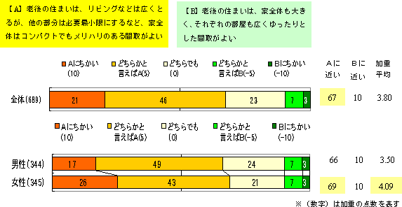 また、間取りについても、「リビングは広くとるが、家全体はコンパクトなメリハリのある間取」(A)、「家全体を大きく、それぞれの部屋も広くした間取り」(B)の許容度も、Aに近いが21%に対し、Bに近いは3%で、コンパクトでメリハリのある間取を支持しています。性別では女性の方が、家全体はコンパクトでもメリハリのある間取を支持しています。