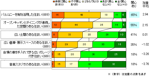 定年退職すると自宅で過ごす時間が多くなります。住宅メーカーの新商品でも趣味を活かせるプランなどの提案が活発ですが、老後の住まいとして“6つのプラン(戸建)”についての関心度を聞いたところ、人気が高かったのは「バルコニーを有効活用した住まい」(関心あり65%)、「オープンキッチンとダイニングが連続した広々空間の住まい」(関心あり55%)で、ガレージ付とか音楽スタジオ付などへの関心は意外に評価が低く、限定されたニーズといえそうです。
