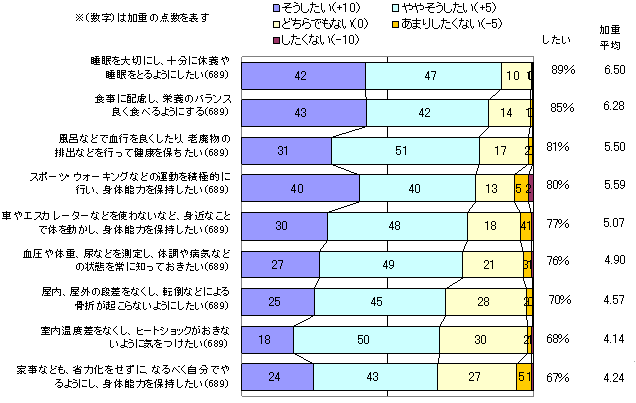 3.健康意識中高齢層になると健康への関心は一段と高まり、食事に気をつける、スポーツなど生理的な健康配慮と運動を意識して行う人が多くなります。健康意識の中で上位は「睡眠を大切にし、十分に休養や睡眠をとるようにしたい」(89%)、「食事に配慮し栄養バランスを考えて食べるようにする」(85%)が双璧となっています。さらに、そうしたい・ややそうしたいの賛成派がどの項目も6割を超え、健康への意識が高くなっています。