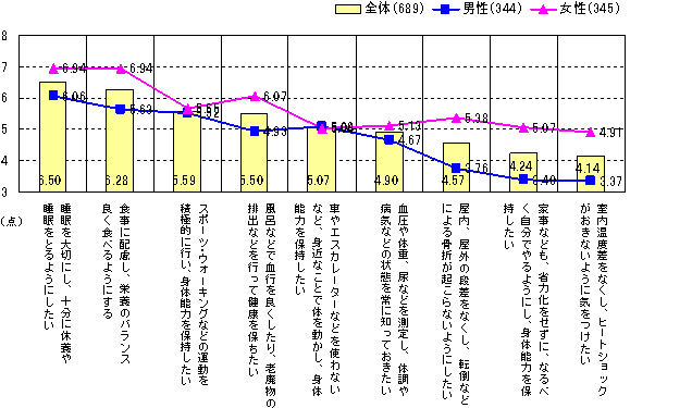性別で見ると、注目したいのはこれらすべての項目で女性のほうが男性よりもポイントが高いこと。加重平均で1ポイント以上差が出た項目は、「段差をなくし、骨折が起こらないようにしたい」(1.6ポイント差)。「家事も省力化せずに自分でやる」(1.6ポイント差)「温度差をなくしヒートショックがおきないようする」(1.5ポイント差)と、身体能力を保持するためにも、骨折や温度差なしへの配慮は、女性の方で意識が高いといえます。