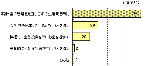 4.お金についての考え方定年退職後は収入が大幅に減るのが普通で、生活スタイルを変える人が大半です。「定年後もできるだけ働いて収入を得る」29%、「積極的に金融投資を行ない増やす」が20%ありますが、「家計・維持管理費を見直し、生活費を節約する」が78%と圧倒的に多く、中高齢者は節約意識が強いといえます。