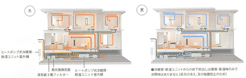2階の子ども部屋は——2階の子ども部屋は2部屋を用意。子どもが幼い頃は一部屋をプレイルーム、もう一部屋を寝室とし、子どもの成長に応じてそれぞれが部屋を持つことで独立心を養えるように配慮しています(子ども2人の場合)。成長に応じた可変性も特徴となっているほか、整理・整頓を工夫できる収納もそれぞれの部屋に設けました。LDKからつながる階段を上ったスペースには家族で使える「ファミリーライブラリー」を設置。吹き抜け越しに家族の気配を感じながら子どもが安心して読書ができるように配慮したものです。もちろん、側には辞書や本をおけるスペースも確保しています。さらに2階トイレにも本棚を設けていますが、これは本を読みながらゆっくり用を足すことで健康増進にも役立つという配慮があります。 ■「快適エアリー」や大容量PV搭載今回のモデルハウスには、「快適エアリー」を搭載しています。ユニット工法ならではの床下大空間にヒートポンプ式空調と、熱交換式第1種換気システムを併設することで、床下空間も含めた温湿度、空気環境を季節に応じて調節する通年型空気調節システムです。冬は暖気を床下にも噴出すため、1階全体が「温度差の少ない暖かさ」と「足元からじんわりあったか」はそのままに、冷房・除湿機能の追加で熱ごもりの少ない「夏のさわやか」への要望も実現できるようになりました。最も活用度の高い1階LDKではメイン空調としてしっかり冷暖房・除湿。2階を含めた他のスペースは余力を分配するサポート冷暖房として機能します。個別のエアコンを必要に応じて最小限運転することで快適に過ごせ、特に冬場はヒートショック等の原因となる温度差の軽減を図ります。