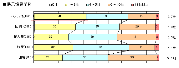 バブル後世代の展示場見学数は、「1~3社」が41%、「4~5社」33%、「6~10社」22%、平均4.7社で、他の世代より少ないのが特色です(団塊世代23%、団塊ジュニアの33%)。展示場に行く前にインターネットなどの情報で検討してから展示場に出向いていると考えられます。