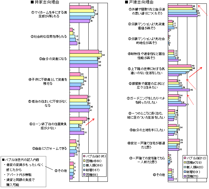 戸建て志向の理由も興味深いものがあります。①「外観や間取りなど自分たちの思い通りにつくれそう」、②「上下階の世帯に対する気遣いのない生活をしたい」が戸建てを選択した2大理由ですが、世代によって格差があるのが興味深いところです。①ではバブル後世代は50%で全世代中最も低く、②ではバブル後世代は49%で2位でした。