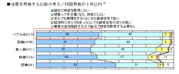 バブル後世代の持家、戸建てに対する意欲「絶対に持家を取得したい」は46%で、団塊ジュニア世代より3ポイント、新人類世代より7ポイント高くなっています。持ち家志向理由で高いのは、「ローン終了後の住居費負担が少ない」。戸建て志向理由では、「上下階の世帯に対する気遣いのない生活」と実質的な面を優先。一方「外観や間取りが自由」「ペット・ガーデニング」「部屋数や居室の広さなど」といった戸建への夢や憧れを表す項目は、ポイントが低いことが特徴です。