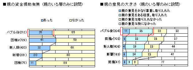 バブル後世代は、マイホーム取得の際に35%が親の資金援助を受けており、その平均金額は908万円。団塊ジュニア世代より約180万円多くなっています。また、資金援助の有無を問わず全体の46%が「親の意見を取り入れた」と、親の影響が大きいことがわかりました。