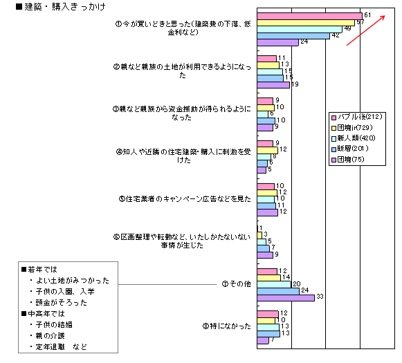 建築・購入のきっかけの第1位は「今が買い時と思った(建築費の下落、低金利など)」。若年層ほどそう思っており、バブル後世代で61%、団塊ジュニア世代57%、新人類世代48%、断層世代42%。