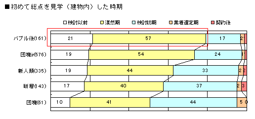 若年世代ほど早い時期に展示場に出向いており、バブル後世代は「住宅を検討以前」「漠然期」での見学が78%もあり、この時期に蓄積された情報が検討開始後の業者絞込みに少なからず影響しているものと思われます。