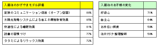 当社の「かげやまモデル」入居者を対象としたアンケート調査では、住性能(安心・快適・環境)といった基本事項に加え、家族コミュニケーション(親子間・夫婦間)や教育(子どもの心の成長・学習・生活習慣の改善)といった事項についても高い評価を得ており、「かげやまモデル」の有効性を確認することができました。特に入居後のお子さまの変化については、好奇心・自立心・お手伝い頻度・後かたづけで、5割以上の方が改善したと回答。