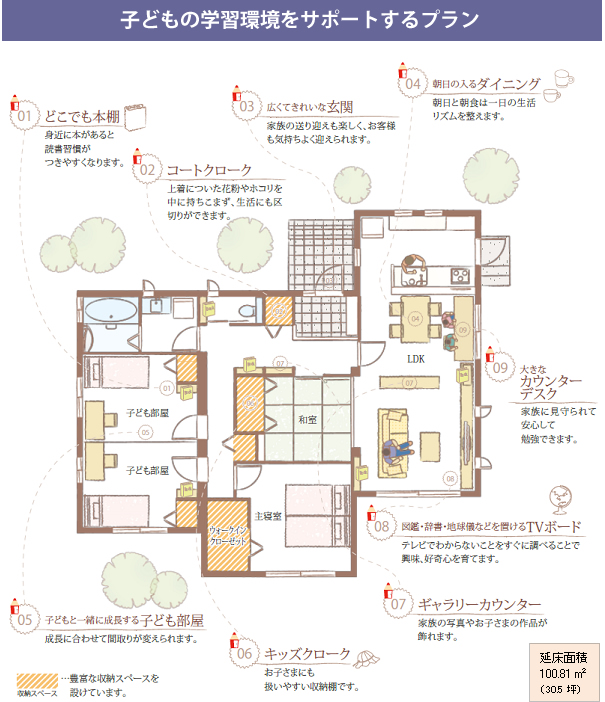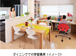 セキスイハイムグループでは、子育て世代への訴求強化の一環として、立命館大学 隂山英男教授とのコラボレーションによる『かげやまモデル』を展開、好評を得ています。特徴は、(1)どこでも学習できる場所づくり、(2)生活習慣を支えるしかけ、(3)家族のコミュニケーションを演出するの3点。『楽の家ファミリースタイル』では、この「かげやまモデル」もラインアップしました。