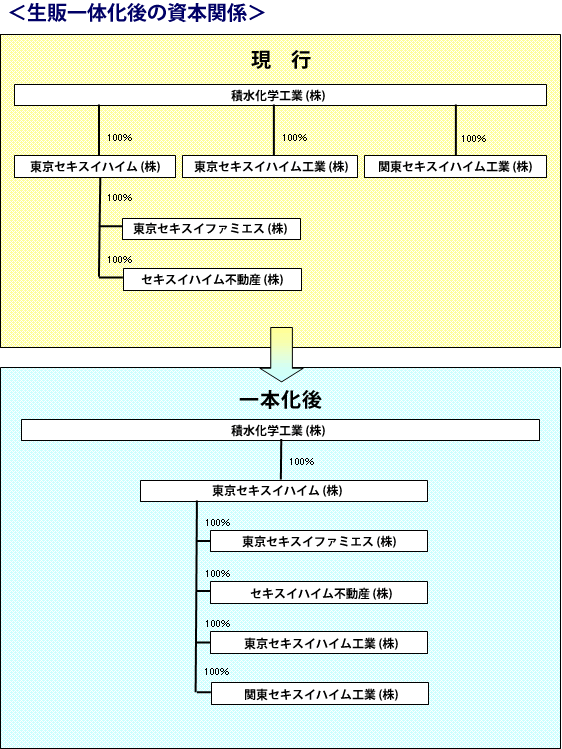 東京セキスイハイム株式会社(社長:渡辺博行)は、2011年7月1日付で住宅生産部門の東京セキスイハイム工業株式会社(社長:荒木龍彦、資本金3億円、積水化学工業全額出資)と関東セキスイハイム工業(社長:荒木龍彦、資本金1億円、積水化学工業全額出資)の株式を積水化学工業からすべて譲り受けて完全子会社化し、生販一体運営に移行します。
