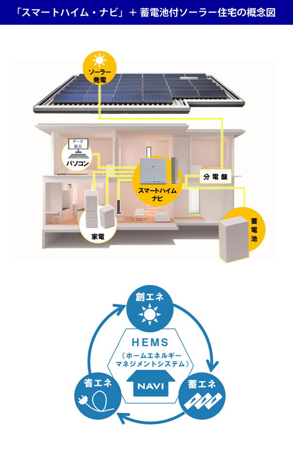 「スマートハイム・ナビ」+蓄電池付ソーラー住宅の実証実験をスタート積水化学工業株式会社 住宅カンパニー(プレジデント:高下貞二)は、家庭用蓄電池の本格採用に向けた「蓄電池付ソーラー住宅」の実証実験をスタートさせます。