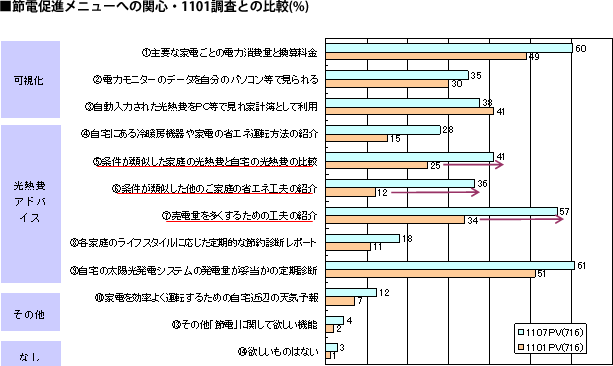 特に、PV採用者の節電ストレスの低さはどこから来ているのかを見ると、節電の仕方にあることがわかりました。PV採用者は、電力消費ピーク時間帯(9時~17時)に集中して節電しているのです。PV採用者にとってはこの時間帯の節電はソーラーが最も発電する時間帯でもあります。反対に深夜の時間帯での節電はPV非採用者を下回っています。PV採用者の多くが時間帯別電灯契約をされており、時間帯ごとにメリハリある節電を心がけているのが節電ストレスの低い理由といえるのではないでしょうか。また、節電促進メニューに対する要望は、震災前の1月調査に比べて大きくポイントを伸ばしており、特に電力消費の可視化、また、他の家庭との相対比較を含む生活面でのアドバイスなどを求める声が更に強まっています。
