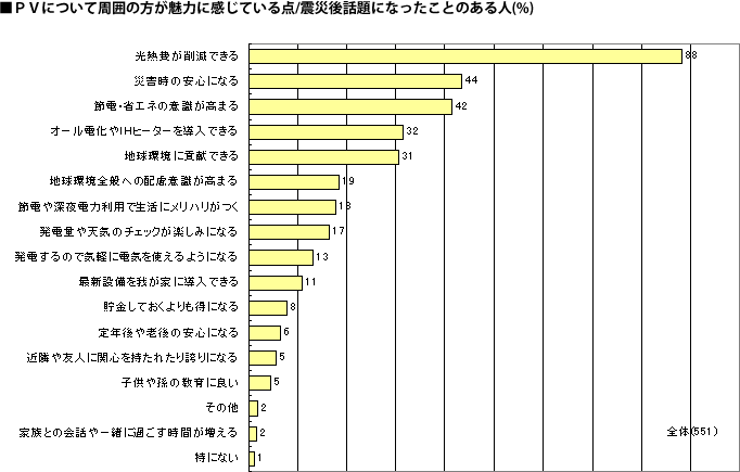 周囲の感じているPVの魅力は「光熱費削減」88%が圧倒的に高く、次いで「災害時の安心」44%。また「オール電化」32%も4位で、依然として人気があるのが注目されます。