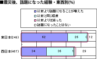 震災後のPVに対する周囲の関心は高く、東日本では62%、西日本では34%が震災後、「以前よりPVが話題になることが増えた」としています。