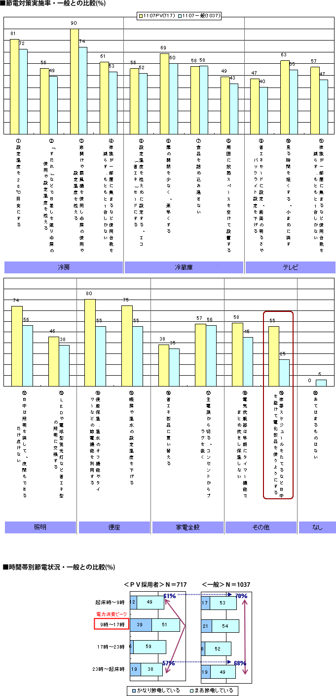 PV採用者にとっては、電力消費ピーク時=発電(売電)時間帯であることもあり節電実施率が高く、反対に電力供給に余裕がある深夜を含む時間帯(起床時前後)は一般を下回っています。メリハリある節電が特徴です。