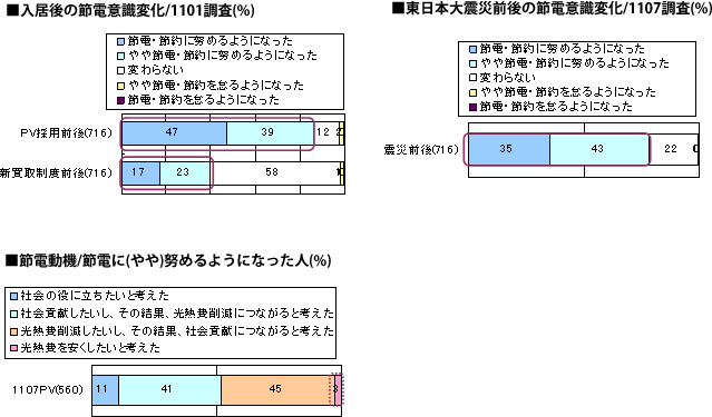 2011年1月の調査では「節電・節約に(やや)努めるようなった」はPV採用前・後で86%、余剰電力の新買取制度開始前・後では40%と、節電・節約意識はかなり高まることが確認されていましたが、今回の調査では、震災後、「節電・節約に努めるようになった」35%、「やや努めるようになった」43%と、更に節電努力を重ねていることが明らかになりました。