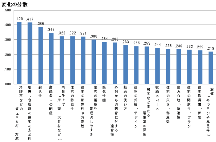 震災前後における住まい選びの重視度に関して、項目別に大きく変化した人(もともと重視していた→震災後さらに重視、もともと重視していなかった→震災後は重視)と変化しなかった人(もともと重視→震災後も重視、もともと重視していなかった→震災後も重視しない)などの変化の分散を見ると、項目により差があり、変化の分散が大きいのが、住まい選びの重視ポイントで上位でもあった「冷暖房などの省エネルギー対応」「地震・台風時の住宅の安全性」「耐久性」でした。