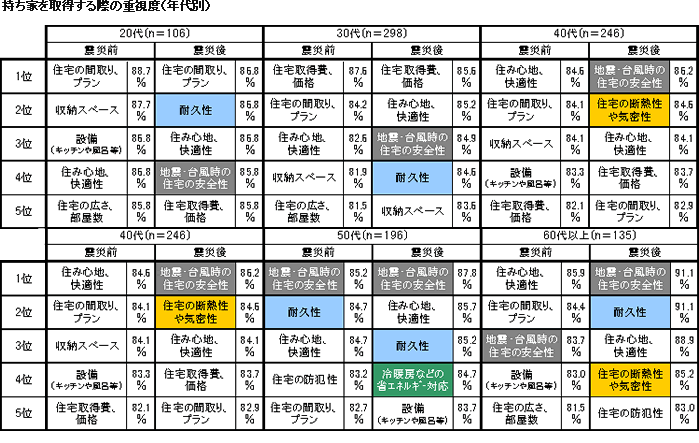 年代別の傾向は、20代や30代など若年層は震災前、「収納スペース」「設備(キッチンや風呂等)」「住宅の広さ、部屋数」などが上位でしたが、震災後は「地震・台風時の住宅の安全性」「耐久性」「住み心地」などの住宅の性能や機能面を重視する傾向が顕著に見られます。40代は「地震・台風時の住宅の安全性」や「住宅の断熱性や気密性」が上位、50代は震災前も「地震・台風時の住宅の安全性」「耐久性」などを重視する傾向がありましたが、震災後その傾向がさらに強まり、加えて「冷暖房などの省エネルギー対応」も重視するようになっています。