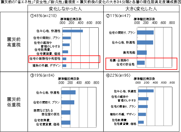 住まい選びの重視度(安全性、省エネ性、耐久性)が震災で大きく変化した人(もともと重視していた→震災後さらに重視、もともと重視していなかった→震災後は重視)と変化しなかった人(もともと重視→震災後も重視、もともと重視していなかった→震災後も重視しない)別に見ると、住宅満足度に関係するポイントに違いがあることが明らかになりました。