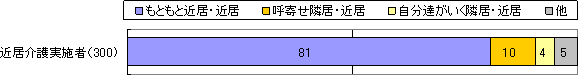 介護をする以前から隣居・近居をしていた「もともと近居・隣居」は81%、介護のために「呼寄せ、自分達がいき隣居・近居」は14%。近居介護の実施者は、既に隣居・近居状況にある方がそのまま介護の状況になっており、呼寄せて隣居・近居を行った方は、少なくなっています。