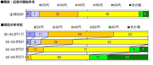 現在の年令別で見ると、50才代前半で40才代から、50才代後半では50才代から、60才代前半では50才代からが多く5~10年前ぐらいから、近居を開始している事がわかります。