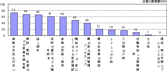 生活支援の内容は、「外出の付き添い」73%、「家事支援全般」68%「話し相手」66%、「役所や銀行など諸手続き」61%「食事の世話」60%が上位5項目となっています。