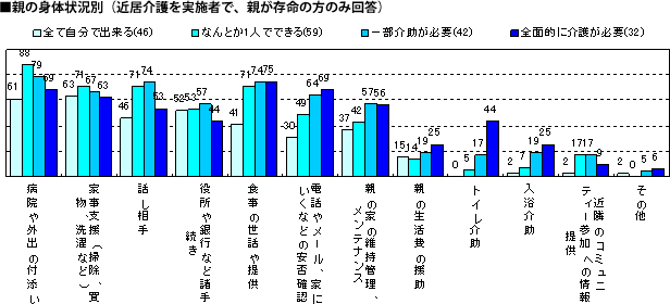 親の身体状況別で見ると、比較的元気な「なんとか1人でできる」時は、外出の付添い、話し相手などが多く、身体状況が低下する程、安否確認、家の維持管理、入浴やトイレ介助といった項目が多くなります。食事の世話は、「何とか1人で出来る~全面的に介護が必要」の方でも、支援している割合が高い項目となっています。
