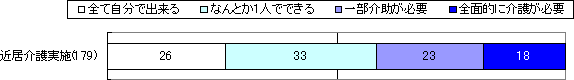 「全て自分できる」26%、「なんとか1人でできる」33%、「一部介助が必要」23%、「全面的に介護が必要」は18%。