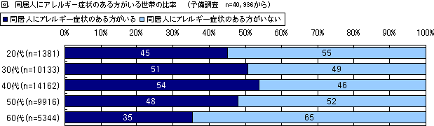 本調査の予備調査では本人を含む家族に花粉症、気管支炎、アトピー性皮膚炎など何かしらのアレルギー症状(自覚症状も含む)のある方がいる世帯は年代別で40代が最も高く54%、次いで30代の51%。60代を除く各世代で約半数の世帯にアレルギー症状のある方がいることが分かりました。