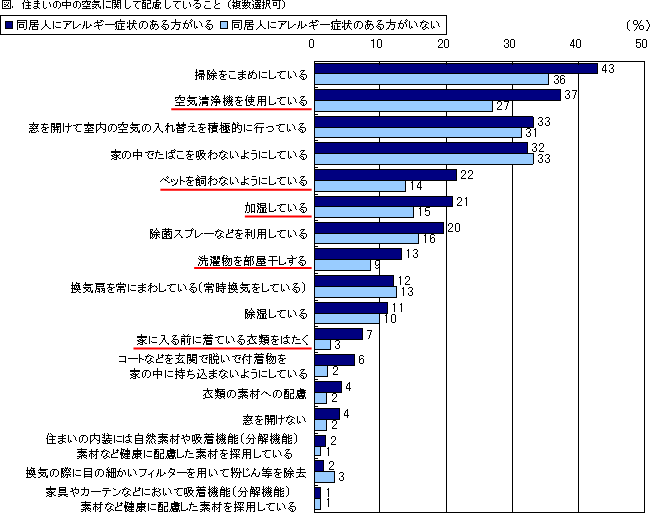 「窓を開けて室内の空気の入れ替えを積極的に行っている」「家の中でたばこを吸わないようにしている」など日常生活において配慮が行われていますが、アレルギー症状のある方がいる世帯ではより配慮を実施。また住まいの中の空気についての関心度が高く、掃除をこまめにするほか、空気清浄機、加湿器などの機器を使って室内空気をきれいに保つ努力をしています。