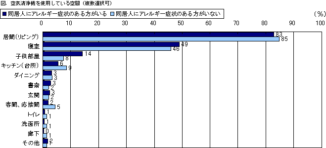空気清浄機の利用は、在室時間が長いリビングに設置が80%以上と圧倒的。アレルギー症状のある方がいる世帯は、寝室や子供部屋での利用も多く、就寝時にも配慮しています。