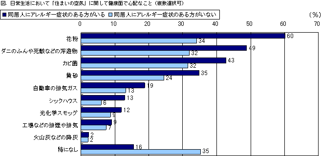家族にアレルギー症状のある方がいる世帯は「住まいの空気」についての関心が高く、外から飛来する花粉と同様に、住まいの中で発生するダニのふん、死骸などの浮遊物、カビ菌についても心配しています。