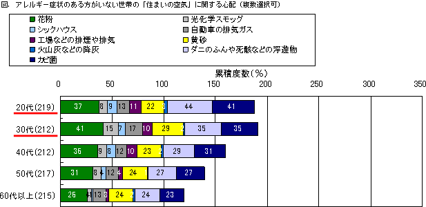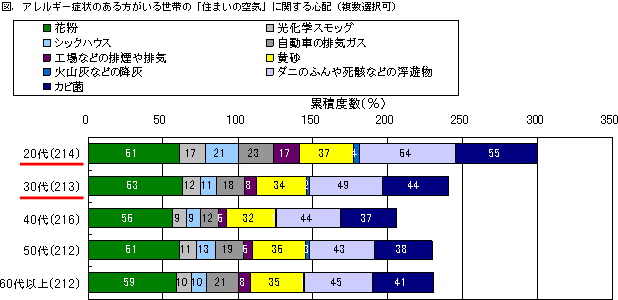 アレルギー症状のある方の有無によって「住まいの空気」への関心に差があり、アレルギー症状のある方がいる世帯は花粉だけでなく、住まいの中で発生するダニのふん、死骸などの浮遊物、カビ菌など住まいの中の空気質にも関心を示しています。特に20代、30代など若い世代が室内の空気に強い関心を示しているのが注目されます。