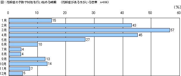 花粉症の予防や対処を始める時期は、スギ花粉が飛来する2~4月がピークですが、秋の発症も13~14%程度あります。様々な花粉による影響があり、年間を通じた対応が必要となっていることを示しています。