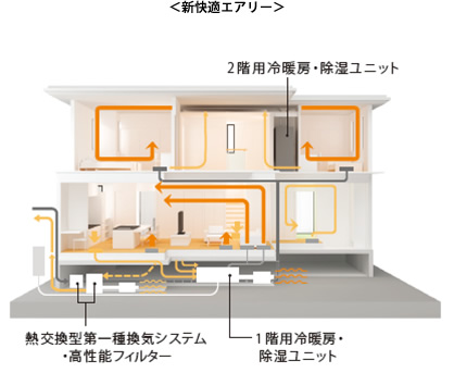独自の全室空調「新快適エアリー」を新たに開発しました。従来の「快適エアリー」は、床下大空間に設置したヒートポンプ式空調が最も活用度の高い1階LDKのメイン空調として冷暖房・除湿を行い、2階はサポート空調として、補助エアコンを必要とするシステムでしたが、「新快適エアリー」では2階にもヒートポンプ式の集中型冷暖房ユニットを設置。家じゅうの居室全てで個別エアコンを不要にしながら温度差を少なくすることが可能になり、快適性とインテリア性を高めました。