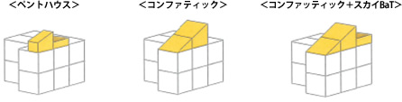 建て替えを行う際に課題となることとして、敷地の狭さや厳しい建築条件などがあります。それに対応するため、部分傾斜屋根(「台形ユニット」)を活用して屋上利用や小屋裏収納を実現する「コンファティック」を導入しました。
