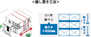 また、水平方向のゆとり実現のため、ユニット間のスペース(236㎜)を拡張する「離し置き工法」を導入しました。延べ床面積を調整しやすくなり、各種設備や居室のゾーニングのバリエーションも拡大。これにより使いやすいサニタリーやゆったりした和室など、ゆとりのある空間提案が可能となります。ユニット数が変わらない、もしくは減らせるケースもあるため、建築コスト(総額)の上昇を抑えながら空間のゆとりを拡大し、コストパフォーマンスを高めています。