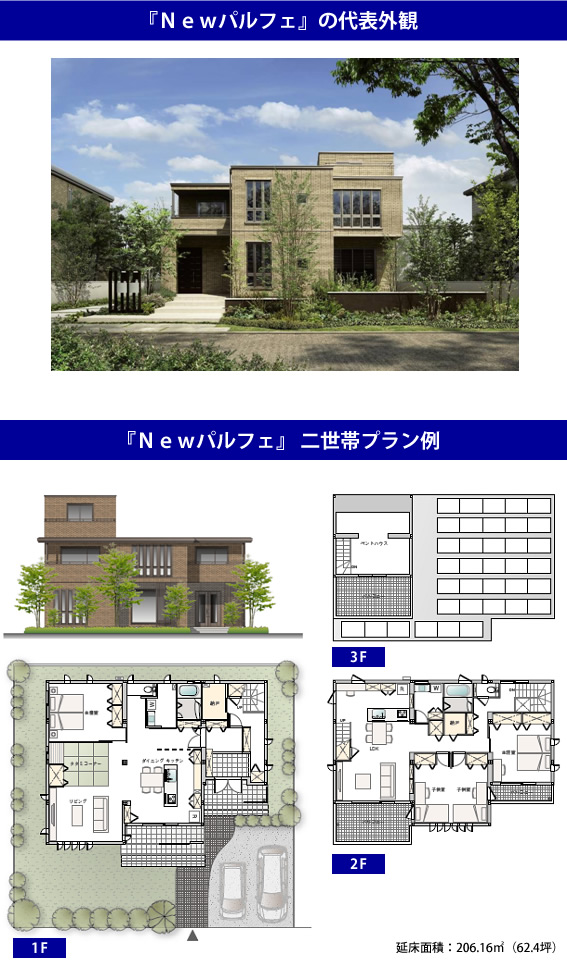 新商品『Newパルフェ』は、この「進・スマートハイム」仕様に加えて、建て替えをお考えのお客様が住まいに求める要素を強化した商品です。耐震仕様の強化のほか、節電や節水メニューも強化して家計の負担をより軽減。さらに独自の全室空調により家全体で温度差が少なく健康的な空間を提案し、プライバシー配慮のための高性能遮音床(L-55)を用意するなど、二世帯住宅を含む建て替えの多様なニーズに対応しています。また「新レジデンスタイル」によるメンテナンス性に優れながら洗練された外観、新しい屋上空間の導入など、魅力・快適空間の導入も特徴です。
