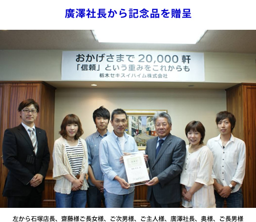栃木セキスイハイム株式会社(本社:宇都宮市、社長:廣澤英次)では4月に累積販売棟数が2万棟を突破。これを記念して6月9日(土)、2万棟目のお客様を宇都宮市東宿郷の本社に招き、感謝状と記念品を贈呈しました。