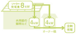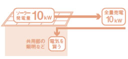 オーナー様と電力会社による契約形態。発電した電力を共用部や隣接するオーナー様宅で使用し、残りをオーナー様が売電。この場合は10㎾未満であればJ-PECの補助金が使えて光熱費削減が可能となります。買取期間は10年。