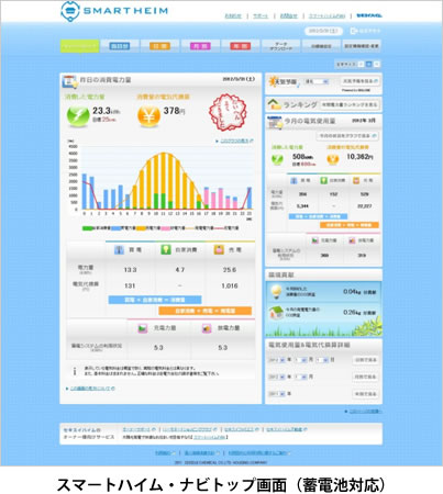 7月から機能強化した「スマートハイム・ナビ」は蓄電池対応仕様となり、トップ画面に蓄電池の期間別の充電推移等を新たに表示できるようになりました。さらにエネルギー消費の表示についても、消費量の前年比較と売電買電金額の履歴の表示も追加し、総消費量/日・発電量/日・売電量/日・買電量/日の年間のベスト5(最大・最少)等がわかるようになりました。新たな「見える化」機能強化により省エネを促進します。