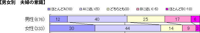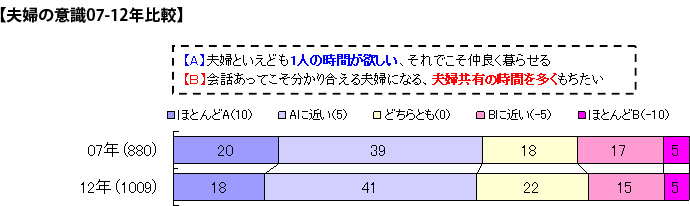 「夫婦といえども1人の時間が欲しい、それでこそ仲良く暮らせる(A)」については、「ほとんどA」18%、「Aに近い」41%で、合わせて59%が考え方を支持しています。2007年との比較で見ると割合に変化はなく、この年代では当たり前の意識として定着している様子が伺えます。