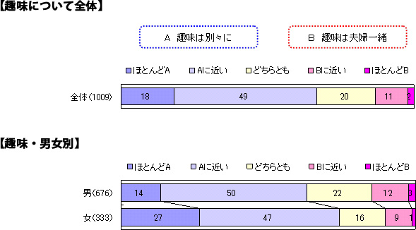 趣味については、「別々に」それぞれ好きなことをしたいというのが男性69%、女性74%と多く、男女とも趣味は別々にと考えている方が多いようです。