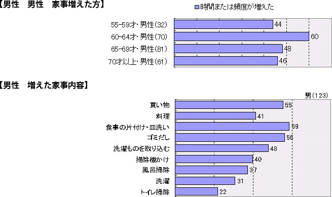 特に家事が増えたのは男性の60-64才(60%)。増えた家事内容は、男性では「食事の片付け」59%、「ごみ出し」56%、「買い物」55%、「洗濯物を取り込む」48%など。定年直後の男性では、在宅時間が増えたことで家庭内における役割を果たそうとしている様子が伺えます。