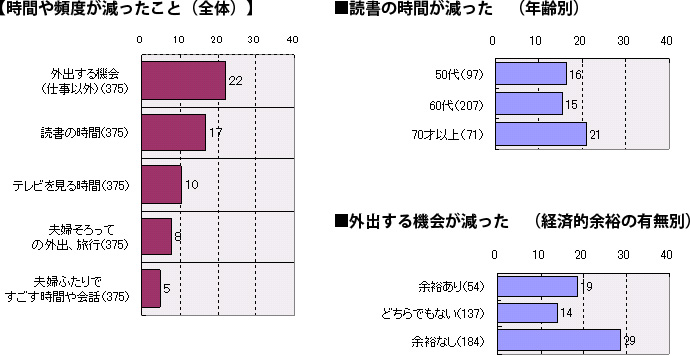 時間や頻度が減ったと答えた方では「仕事以外の外出」や「読書の時間」が上位となっています。仕事以外の外出が減ったのは、経済的理由から。また読書の時間は、70才以上の減少が目立っています。