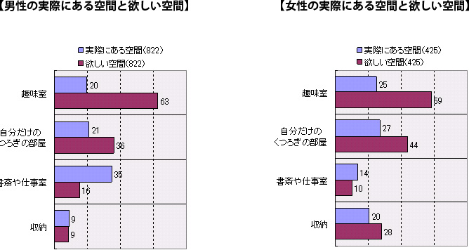 実際にある専用空間としては、男性は「書斎・仕事室」35%。女性は「くつろぎの部屋」27%、「趣味室」25%と自分専用はあっても3割程度。欲しい専用空間としては男女とも「趣味室」が第1位となっています。