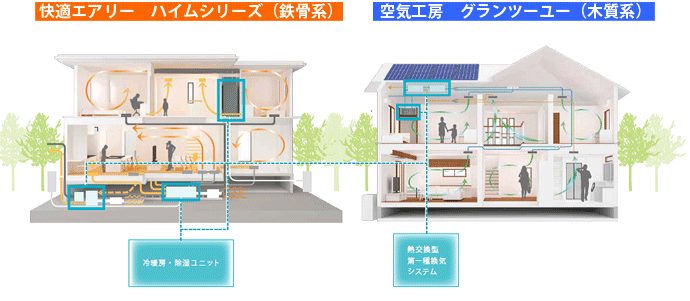 鉄骨系のハイムシリーズに採用する「快適エアリー」は、ユニット工法ならではの床下大空間にヒートポンプ式冷暖房•除湿システム※と、熱交換式第一種換気システムを併設。 木質系のグランツーユーに採用する「空気工房」は、快適エアリー同様の換気システムを2階と小屋裏空間に分散して設置し、地域や生活スタイルに合わせた省エネ空調を組み合わせます。