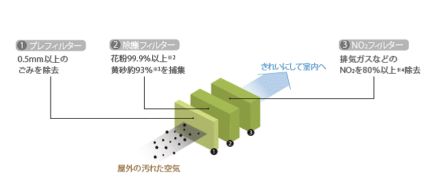 高性能フィルター※1は、花粉を99.9%以上※2、黄砂を約93%※3捕集可能です。